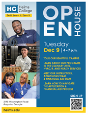 Goodwill Industries of Middle GA & the CSRA would like to announce an Open House at our Helms College campus located at 3145 Washington Road in Augusta, GA on Tuesday, December 9th, from 4:00 to 7:00 p.m. Visitors will have the opportunity to tour the campus, and learn about our Culinary Arts, Health Services and HVAC/R programs. Meet the instructors, admissions team, financial aid staff, and learn how to navigate the application, and financial aid process.