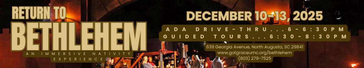 This year’s Return to Bethlehem will take place December 10–13, from 6:30–8:30 p.m., behind Grace United Methodist Church, 639 Georgia Avenue, North Augusta. Admission is free, and donations are warmly welcomed to help continue this meaningful community tradition.