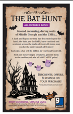 For the entire month of October, Goodwill Industries of Middle GA & the CSRA will be having a scavenger hunt for shoppers. Each day, a bat will be hidden in your local Goodwill Retail Store. Find the bat & bring it to the cashier to win a prize. Prizes include discounts, offers & savings on your purchase. By shopping at Goodwill, you are helping to create opportunities for education and careers in your community. Happy hunting!
